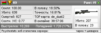 | awp_dust | 68 | 0 | 0.77 | 0.65 | 4 | 122 | 01:44:06 | 18-03-2010 | |