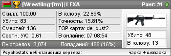 | de_dust2 | 45 | 2 | 0.82 | 0.24 | 24 | 165 | 03:07:08 | 04-02-2010 | |