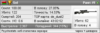 | de_dust2 | 48 | 1 | 0.65 | 0.03 | 8 | 282 | 29:13:04 | 05-04-2010 | |