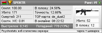 | de_dust2 | 115 | 2 | 0.86 | 0.34 | 8 | 288 | 05:41:54 | 07-02-2010 | |