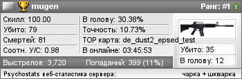 | de_aztec2 | 11 | 0 | 1.22 | 0.37 | 1 | 18 | 00:29:56 | 19-03-2010 | |