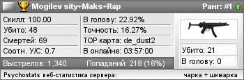 | de_dust2 | 35 | 0 | 0.70 | 0.39 | 10 | 64 | 01:29:20 | 21-03-2010 | |