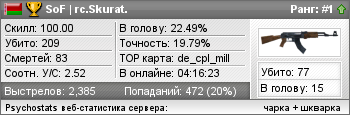 | de_dust2 | 23 | 0 | 0.72 | 0.30 | 5 | 53 | 01:17:06 | 03-04-2010 | |