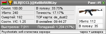 | de_dust2 | 185 | 0 | 1.53 | 0.50 | 15 | 243 | 06:07:41 | 24-03-2010 | |