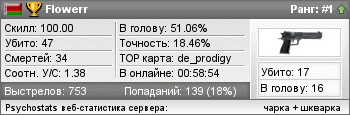 | de_dust2 | 7 | 0 | 1.17 | 0.68 | 2 | 9 | 00:10:16 | 29-03-2010 | |