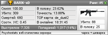 | de_dust2 | 72 | 1 | 0.40 | 0.33 | 9 | 237 | 03:41:31 | 03-04-2010 | |